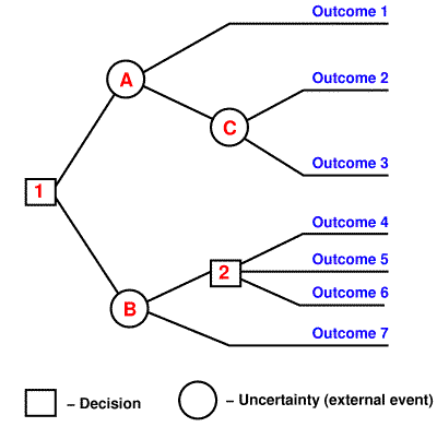 A decision making tree is essentially a diagram that represents, in a specially organized way, the decisions, the main external or other events that introduce uncertainty, as well as possible outcomes of all those decisions and events.